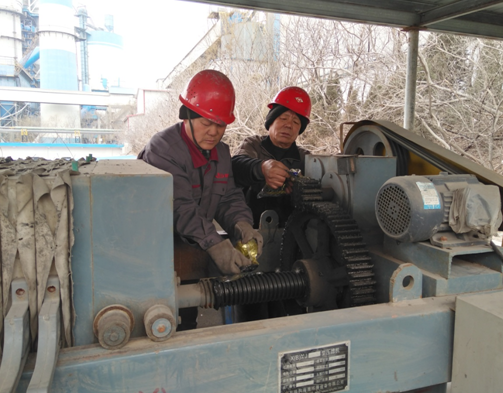 輸煤崗位的老員工劉成軍、白光文正在為壓濾機(jī)加注潤滑油