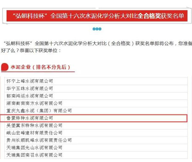 魯蒙水泥榮獲全國第十六次化學分析大對比“全合格”獎項