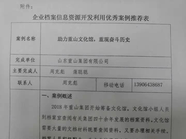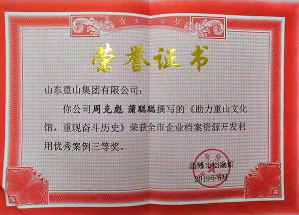 近年來,集團(tuán)公司不斷加強(qiáng)企業(yè)檔案管理、完善檔案資源、建立完善電子檔案系統(tǒng),提高檔案利用水平和查閱效率。近期,集團(tuán)辦公室通過認(rèn)真準(zhǔn)備,積極申報(bào),經(jīng)過區(qū)縣檔案館推薦,評選領(lǐng)導(dǎo)小組評定等程序,集團(tuán)辦公室周克彪、蒲聰聰撰寫的《為旋窯車間檢修保駕護(hù)航》、《助力重山文化館,重現(xiàn)奮斗歷史》分別榮獲全市企業(yè)檔案資源開發(fā)利用二等獎(jiǎng)和三等獎(jiǎng),據(jù)悉這是全市唯一一家榮獲兩項(xiàng)殊榮的企業(yè)。集團(tuán)辦公室將以此為契機(jī),不斷提高檔案管理水平,豐富檔案資源,不斷滿足企業(yè)檔案的查閱需求,為企業(yè)發(fā)展提供更好的服務(wù)。