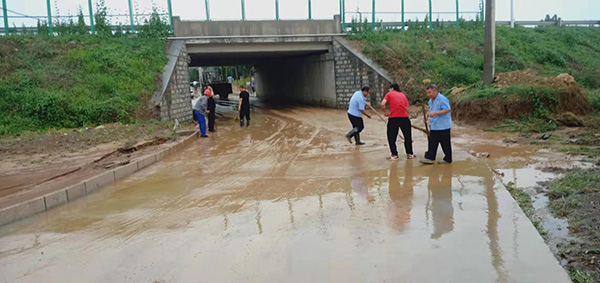 7月25日下午,天氣突變,暴雨傾盆而下。集團(tuán)總務(wù)處主任王宏憑經(jīng)驗馬上意識到村北橋洞內(nèi)可能積水,造成交通隱患,隨即,王宏立即組織人員冒著大雨趕到橋洞現(xiàn)場,經(jīng)勘查,傾盆的暴雨不斷的沖刷著周邊的田地,大量的泥漿堆積在橋洞下面,對職工上下班交通帶來嚴(yán)重影響。王宏一邊派人在路口引導(dǎo)行人走另一條安全道路,一邊組織人員對遭遇上下班險情的職工進(jìn)行救援,同時,協(xié)調(diào)鏟車到橋洞下面清理淤泥,并安排總務(wù)處的員工拿著鐵锨、掃帚奮力清理現(xiàn)場。經(jīng)過大家近2個小時的共同努力,堵塞的橋洞得到及時疏通,險情得到及時排除,保證了職工和行人的交通順暢和安全。