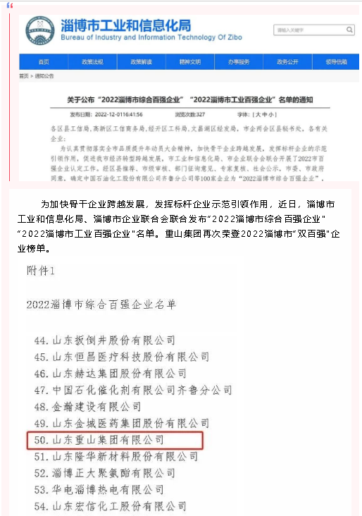 【頭條】重山集團(tuán)榮登2022淄博“雙百?gòu)?qiáng)”企業(yè)榜單