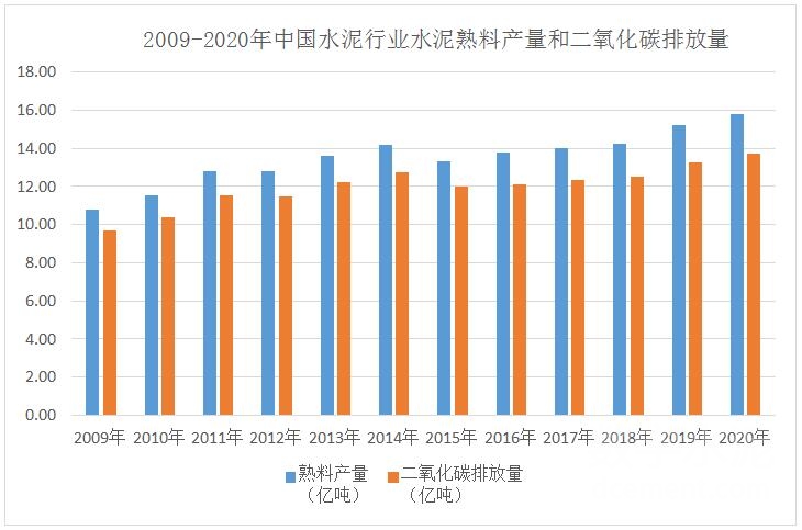 水泥行業(yè)碳排放主要源于燃料燃燒排放和過程排放。在水泥生產(chǎn)過程中,原材料碳酸鹽分解產(chǎn)生的二氧化碳排放這種過程排放占到60-70%左右。水泥行業(yè)碳排放與熟料產(chǎn)量密切相關。中國水泥行業(yè)2009-2020年碳排放如圖1所示,十多年來,隨著水泥熟料產(chǎn)量增加,中國水泥行業(yè)碳排放從9.71億噸逐步達到13.75億噸。隨著我國水泥行業(yè)資源、能源利用化水平的提高,節(jié)能降耗先進技術的應用,嚴禁新增產(chǎn)能、產(chǎn)能減量置換、兼并聯(lián)合重組和常態(tài)化錯峰生產(chǎn)等有效的鞏固去產(chǎn)能政策的推行,利用環(huán)保、質量、能源、技術、安全等綜合標準推動落后產(chǎn)能淘汰,水泥行業(yè)在“十三五”向“十四五”過渡期間碳排放有逐漸達到峰值的趨勢。