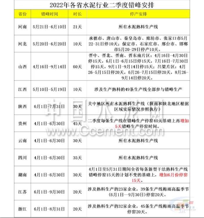 據(jù)中國(guó)水泥網(wǎng)消息,河南省預(yù)計(jì)從5月21日起至6月10日停窯21天;山西晉中、晉北、晉南、晉東南片區(qū)6月1日到7月30日停產(chǎn)30天,呂梁片區(qū)6月26日至7月15日停產(chǎn)20天;河北省水泥熟料企業(yè)5月20日至6月10日,分區(qū)域自律錯(cuò)峰停產(chǎn)10天……