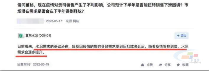 多家水泥企業(yè)也對(duì)后市傳遞出信心,如冀東水泥在回應(yīng)投資者時(shí)表示,受疫反復(fù)、多發(fā)的情影響,目前公司水泥和熟料綜合銷(xiāo)量較去年同期下降。但目前看來(lái),水泥需求的基礎(chǔ)還在,短期因疫情的影響導(dǎo)致需求受到壓抑或者延后,隨著疫情管控到位,水泥需求會(huì)逐步提升。