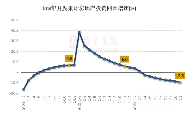 宏觀層面,我國持續(xù)推進(jìn)穩(wěn)經(jīng)濟(jì)政策措施落地見效,但受國內(nèi)疫情沖擊等因素影響,固定資產(chǎn)投資增速有所回落。各地積極推進(jìn)重大項目建設(shè),適度超前開展基礎(chǔ)設(shè)施投資,支撐基礎(chǔ)設(shè)施投資連續(xù)加快,其中,水利管理業(yè)投資同比快速增長,道路運輸業(yè)投資增速有所回落,鐵路運輸業(yè)投資轉(zhuǎn)為正增長。房地產(chǎn)投資方面,盡管政策利好不斷,但從市場表現(xiàn)看,“探底”仍在持續(xù)。1-11月,全國月度累計房地產(chǎn)開發(fā)投資同比降幅繼續(xù)擴(kuò)大,房地產(chǎn)開發(fā)企業(yè)房屋施工面積、新開工面積和土地購置面積同比降幅均有所擴(kuò)大。