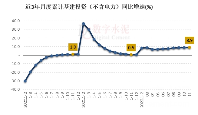 1-11月,全國基礎(chǔ)設(shè)施投資(不含電力)同比增長8.9%,增速較1-10月上升0.2個百分點,高于去年同期8.4個百分點。其中,水利管理業(yè)投資同比增長14.1%,道路運輸業(yè)投資增長2.3%,鐵路運輸業(yè)投資增長2.1%。