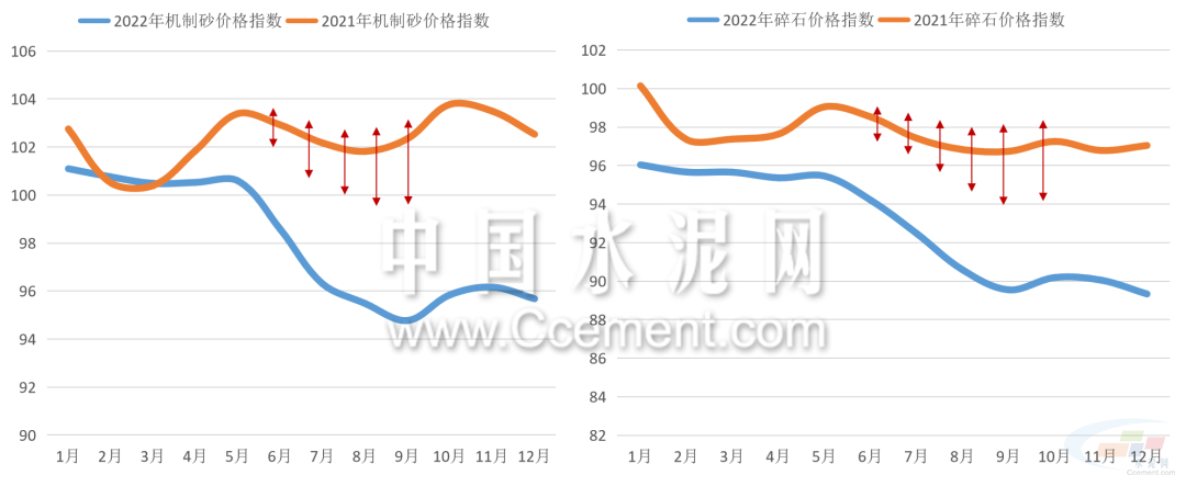 截至12月底,全國碎石價(jià)格指數(shù)報(bào)收88.07點(diǎn),同比下降9.07%。全國機(jī)制砂價(jià)格指數(shù)報(bào)收94.38點(diǎn),同比下降7.49%。從機(jī)制砂均價(jià)來看,2022年砂石價(jià)格整體呈弱勢下跌趨勢,二季度中下旬后價(jià)格行情明顯走弱,4-10月的月均機(jī)制砂價(jià)格指數(shù)同比跌幅持續(xù)擴(kuò)大,四季度后價(jià)格反彈力度并不大。