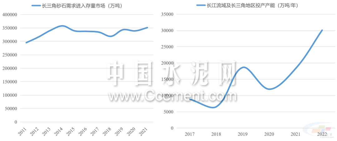 近年來長江中下游城市的砂石骨料需求趨于平穩(wěn),2015年后江浙滬皖地區(qū)的砂石骨料需求量圍繞34億噸均線上下震蕩,長三角地區(qū)需求進(jìn)入存量市場。但是,2017年至2022年,除青海西藏外,長江流域省市(含浙江)每年投放的砂石骨料產(chǎn)能翻了三倍。長江流域面臨供給過剩危機(jī),長期價(jià)格或進(jìn)入下行區(qū)間。