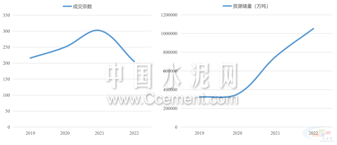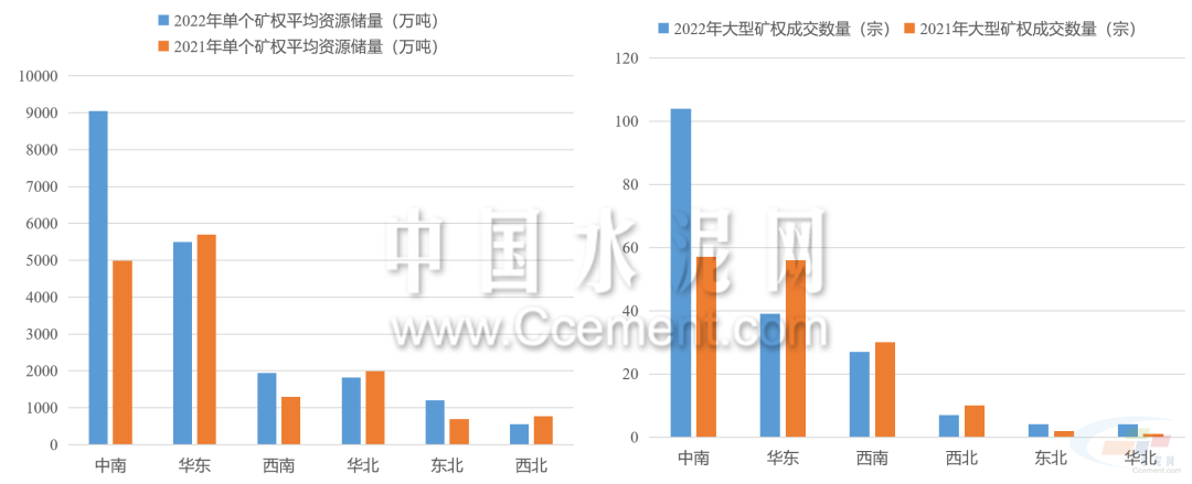 2022年礦權(quán)出讓呈現(xiàn)數(shù)量減少,儲(chǔ)量增長的特點(diǎn)。據(jù)目前已公布的礦權(quán)成交結(jié)果來看,2022年共有774宗型砂石礦權(quán)成交,同比減少12%,共計(jì)出讓資源儲(chǔ)量243.7億噸,同比增長超40%。中南地區(qū)是出讓礦權(quán)資源儲(chǔ)量最高的區(qū)域,占全國出讓資源儲(chǔ)量的六成以上,同比增長超150%。