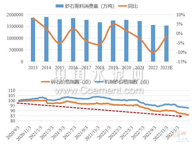 預(yù)計(jì)2023年需求偏穩(wěn)運(yùn)行,二季度后需求或有所反彈。根據(jù)水泥、混凝土的需求預(yù)期,預(yù)計(jì)2023年全國砂石骨料需求同比偏穩(wěn)運(yùn)行,或有小幅下滑。在供需反向變動(dòng)的預(yù)期下,長期價(jià)格進(jìn)入下行區(qū)間,預(yù)計(jì)2023年砂石價(jià)格中樞仍將小幅下移。