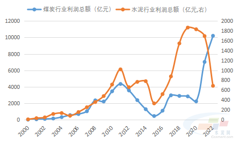 2000年,煤炭行業(yè)和水泥行業(yè)均剛剛實(shí)現(xiàn)扭虧為盈,煤炭行業(yè)實(shí)現(xiàn)利潤總額0.5億元,水泥行業(yè)實(shí)現(xiàn)利潤總額6.33億元,水泥行業(yè)利潤總額是煤炭行業(yè)的12.7倍。22年后,煤炭行業(yè)利潤總額已是水泥行業(yè)的14.9倍,令水泥行業(yè)望塵莫及。