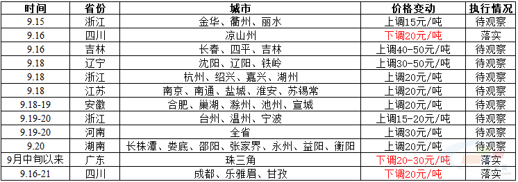 9月中旬以來(lái),華東安徽、江蘇、浙江地區(qū),東北遼寧、吉林地區(qū)以及中南河南、湖南地區(qū)等密集上調(diào)水泥價(jià)格,執(zhí)行情況待觀察,但也有四川、廣東等少部分地區(qū)仍在下調(diào)水泥價(jià)格,且均已落實(shí)??偟膩?lái)看,市場(chǎng)漲價(jià)氛圍濃厚,但上漲動(dòng)力似乎不足。筆者認(rèn)為,需求恢復(fù)偏慢且整體偏弱是當(dāng)前行業(yè)漲價(jià)難以完全落實(shí)的根本原因,今年9月難言“旺季”,漲價(jià)空間有待觀察。