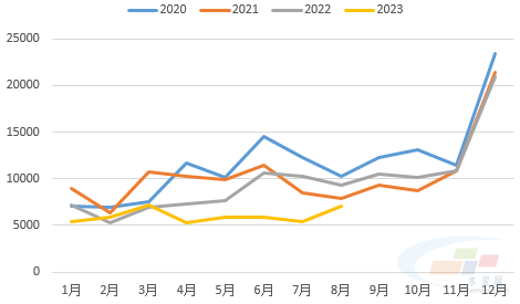 圖3:2023年1-8月100大中城市土地成交面積處于同期低位(萬(wàn)平方米)