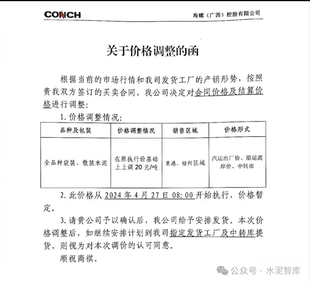 長江沿線地區(qū)水泥價格于4月中旬小幅恢復(fù)性上調(diào)后,4月24日,東北地區(qū)因虧損嚴重,企業(yè)經(jīng)營困難,發(fā)布大幅上漲消息,通知上調(diào)20-60元/噸。