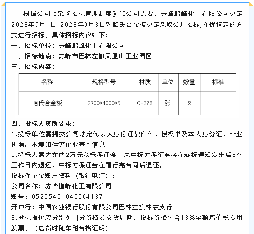 【招標(biāo)公告】鵬峰化工哈氏合金板招標(biāo)