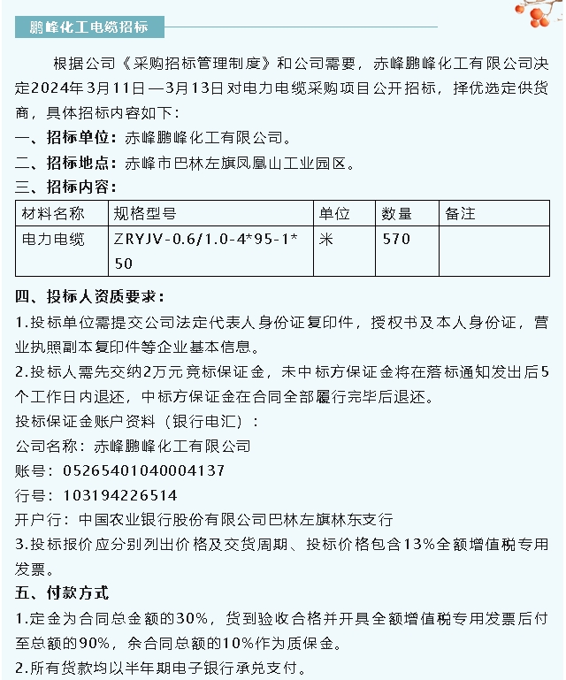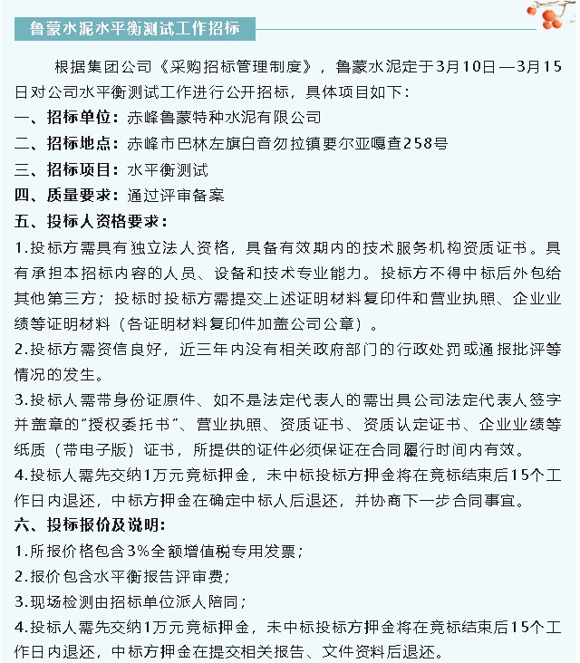 【招標(biāo)公告】魯蒙水泥水平衡測試工作招標(biāo)、鵬峰化工電纜招標(biāo)