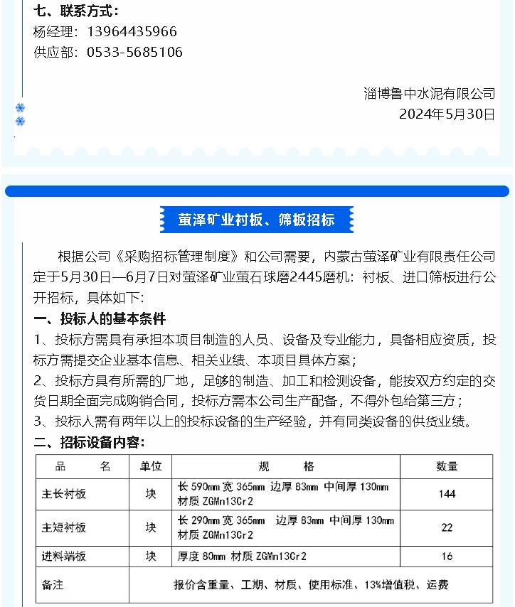 【招標(biāo)公告】魯中水泥煙煤,螢澤礦業(yè)襯板、篩板招標(biāo)