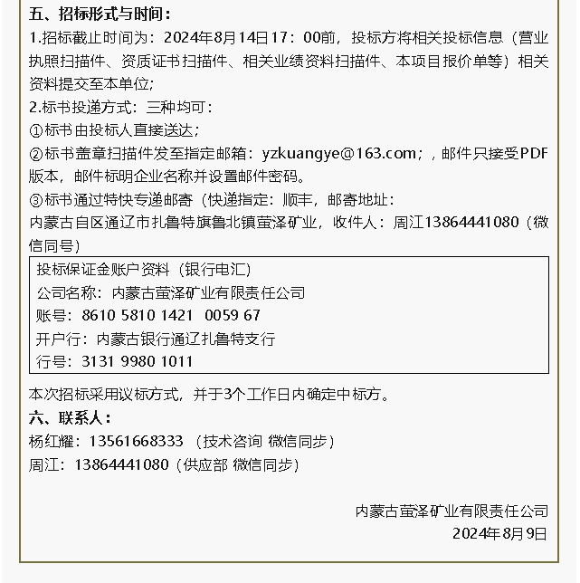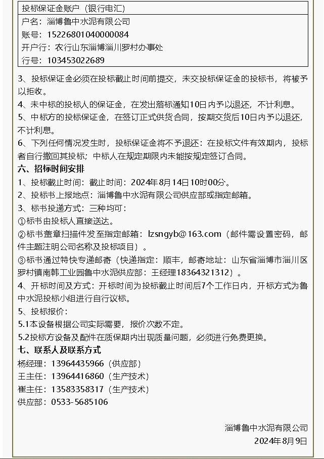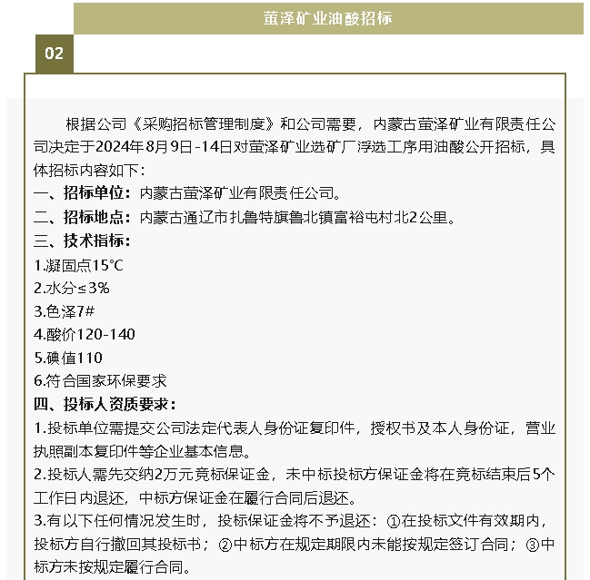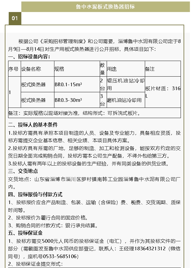 【招標公告】魯中水泥板式換熱器、螢澤礦業(yè)油酸招標
