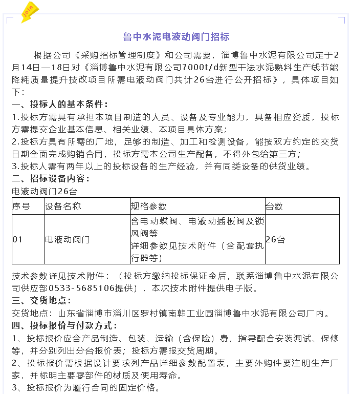 【招標公告】魯中水泥電液動閥門、金屬膨脹節(jié)招標