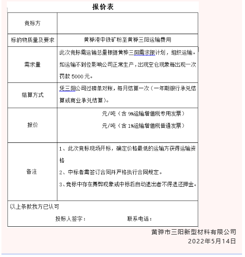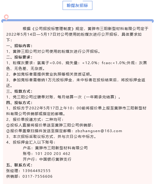 【招標(biāo)公告】黃驊三陽(yáng)粉煤灰、礦粉運(yùn)費(fèi)招標(biāo)