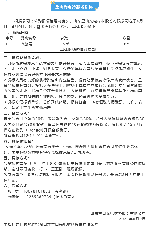 【招標(biāo)公告】重山光電閉式冷卻塔、冷凝器、螺桿式制冷機(jī)、整流器招標(biāo)
