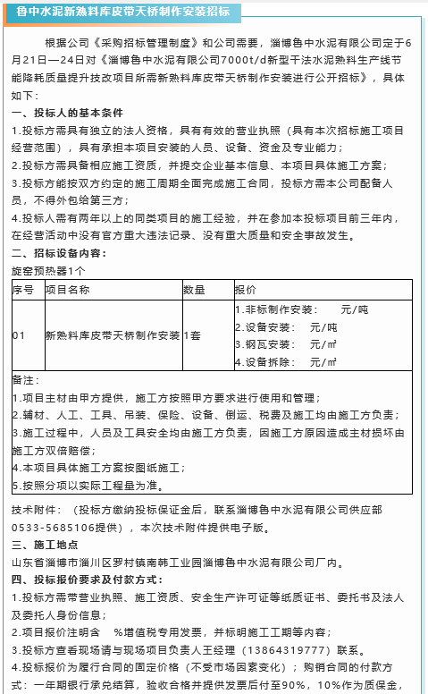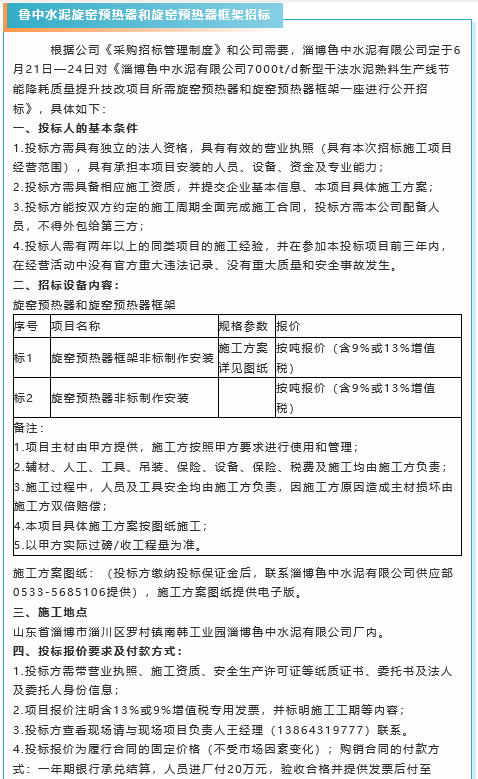 【招標公告】重山集團廢鋼渣鐵、魯中水泥新熟料庫皮帶天橋制作安裝、旋窯預(yù)熱器和旋窯預(yù)熱器框架招標