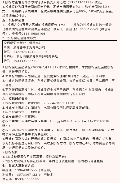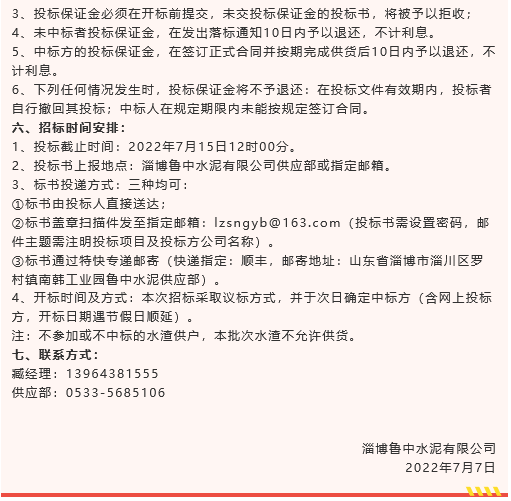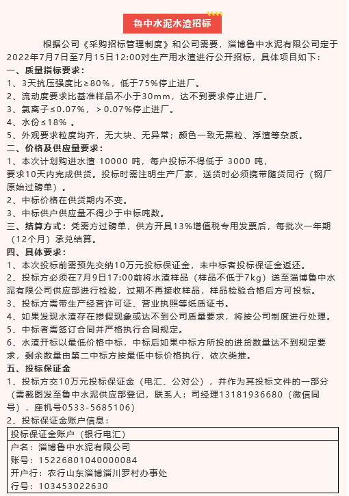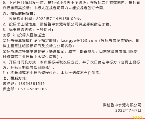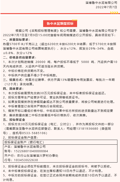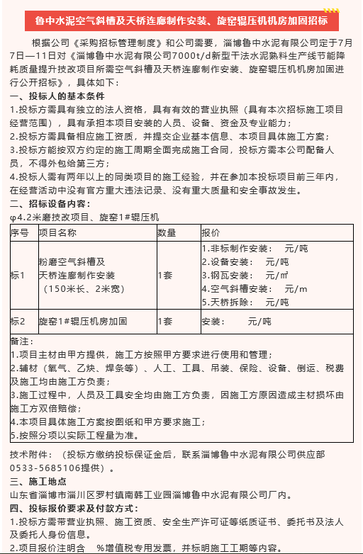 【招標(biāo)公告】魯中水泥水渣、空氣斜槽及天橋連廊制作安裝、旋窯輥壓機(jī)機(jī)房加固、煙煤招標(biāo)
