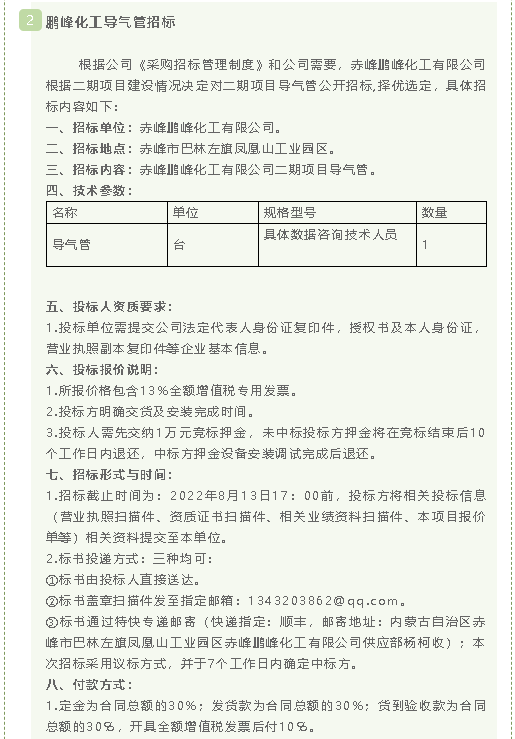 【招標(biāo)公告】鵬峰化工單梁起重機(jī)、導(dǎo)氣管、載冷劑原液招標(biāo)
