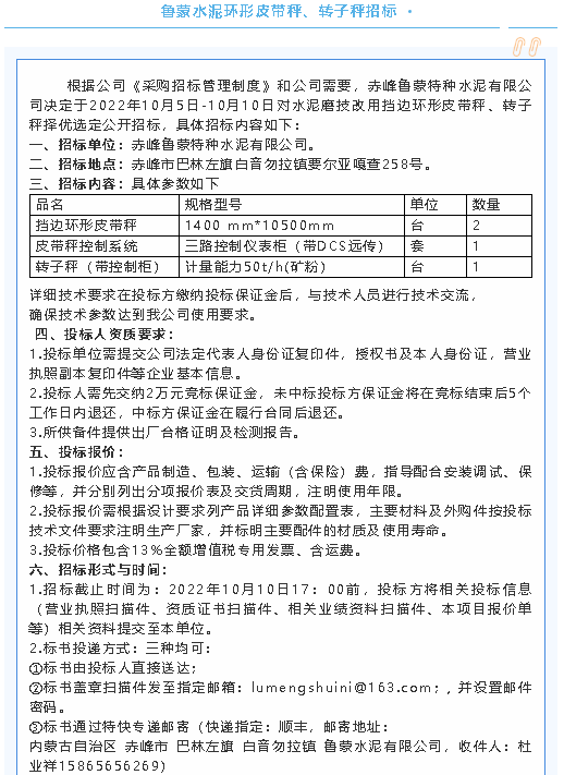 【招標(biāo)公告】魯蒙水泥環(huán)形皮帶秤、轉(zhuǎn)子秤招標(biāo),魯中水泥電纜線、旋窯安裝檢修項(xiàng)目招標(biāo)