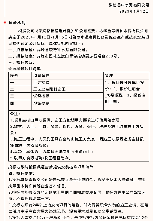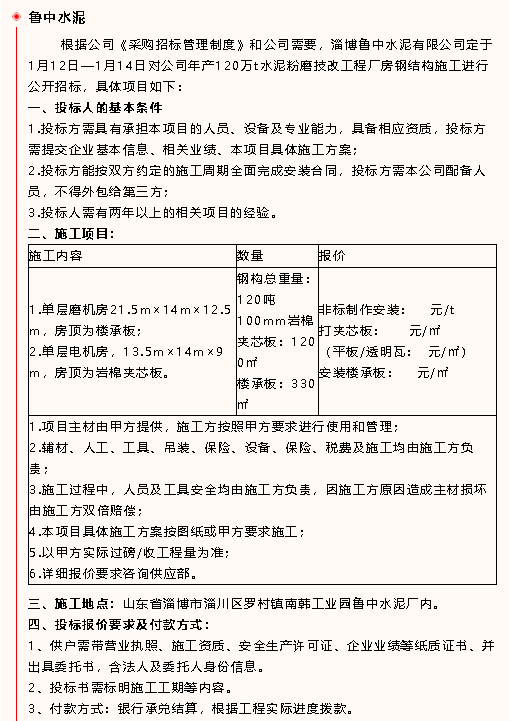 【招標(biāo)公告】魯中水泥、魯蒙水泥