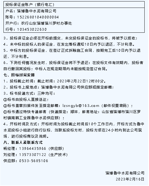 【招標公告】魯中水泥技改工程設備安裝、運輸招標