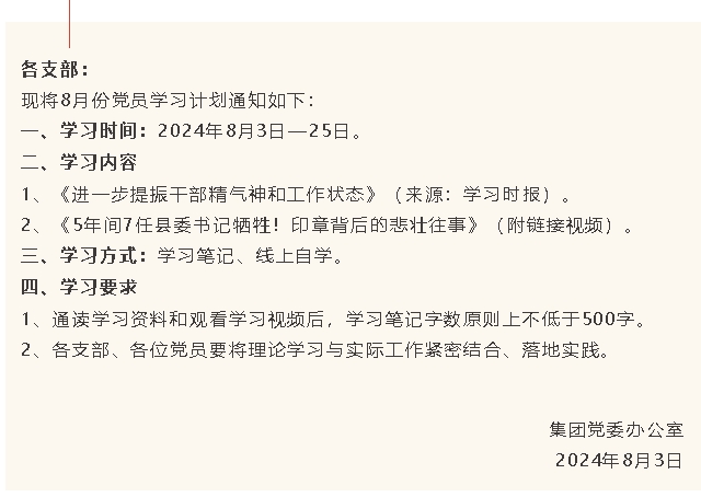 【通知】集團(tuán)黨委8月份學(xué)習(xí)通知