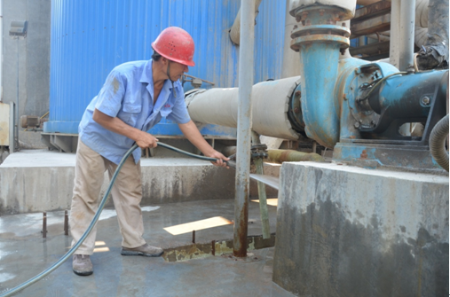熱電廠的操作工正在沖洗導(dǎo)水槽
