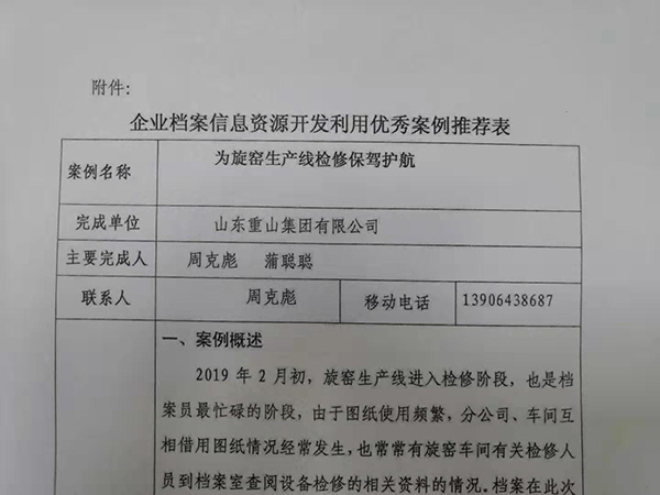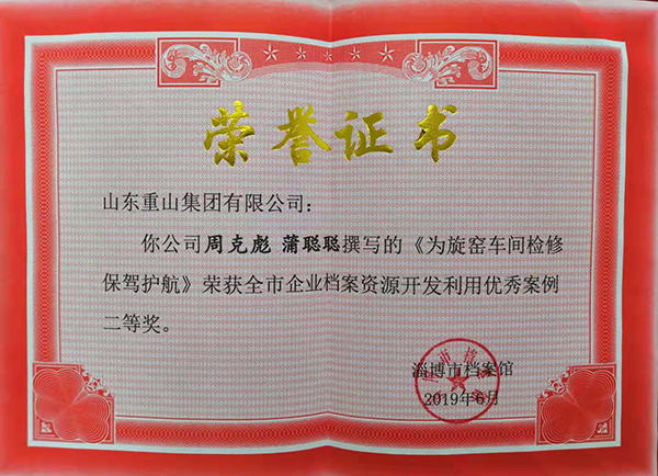近年來,集團(tuán)公司不斷加強(qiáng)企業(yè)檔案管理、完善檔案資源、建立完善電子檔案系統(tǒng),提高檔案利用水平和查閱效率。近期,集團(tuán)辦公室通過認(rèn)真準(zhǔn)備,積極申報(bào),經(jīng)過區(qū)縣檔案館推薦,評選領(lǐng)導(dǎo)小組評定等程序,集團(tuán)辦公室周克彪、蒲聰聰撰寫的《為旋窯車間檢修保駕護(hù)航》、《助力重山文化館,重現(xiàn)奮斗歷史》分別榮獲全市企業(yè)檔案資源開發(fā)利用二等獎(jiǎng)和三等獎(jiǎng),據(jù)悉這是全市唯一一家榮獲兩項(xiàng)殊榮的企業(yè)。集團(tuán)辦公室將以此為契機(jī),不斷提高檔案管理水平,豐富檔案資源,不斷滿足企業(yè)檔案的查閱需求,為企業(yè)發(fā)展提供更好的服務(wù)。
