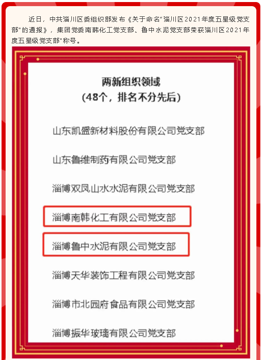 【黨建】南韓化工、魯中水泥黨支部榮獲“淄川區(qū)2021年度五星級(jí)黨支部”稱號(hào)