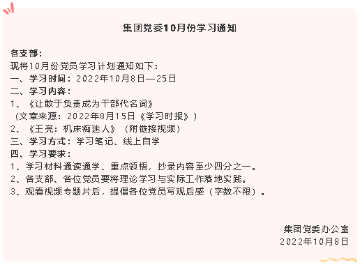 【通知】集團(tuán)黨委10月份學(xué)習(xí)通知
