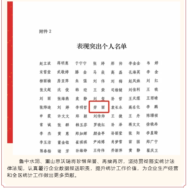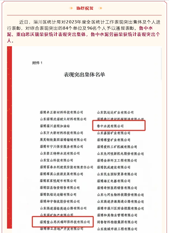 【榮譽(yù)】魯中水泥、思沃瑞榮獲2023年度全區(qū)統(tǒng)計(jì)工作表現(xiàn)突出集體