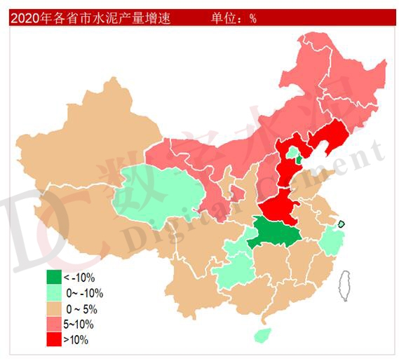 分區(qū)域看,2020年全國(guó)六大區(qū)域市場(chǎng)中,北方區(qū)域累計(jì)水泥產(chǎn)量同比增速持續(xù)提升且快于南部區(qū)域。其中,華北和東北保持高位增長(zhǎng),除京津地區(qū)外各省份同比均有明顯增長(zhǎng),河北和遼寧增速達(dá)到兩位數(shù)以上;西北地區(qū)總體呈現(xiàn)同比小幅增長(zhǎng),除青海需求大幅下降外,其他省份同比均實(shí)現(xiàn)不同幅度增長(zhǎng)。南方區(qū)域中,華東和中南水泥產(chǎn)量年末實(shí)現(xiàn)由負(fù)轉(zhuǎn)正,但長(zhǎng)三角地區(qū)較去年同期仍有小幅下降;西南地區(qū)累計(jì)水泥產(chǎn)量同比仍略有下降,降幅持續(xù)收窄至不足1%。