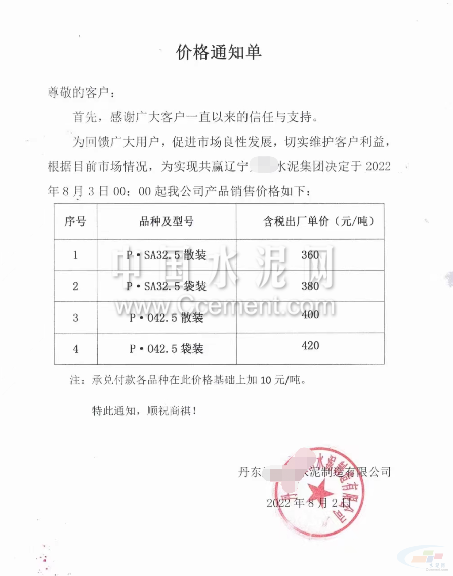 據(jù)市場(chǎng)反饋,8月1日起,遼寧省沈陽(yáng)、遼陽(yáng)地區(qū)水泥企業(yè)通知上調(diào)水泥價(jià)格60-80元/噸。