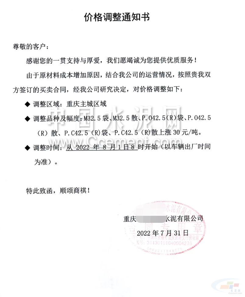 為提升盈利,8月1日起重慶地區(qū)一些廠家通知上調(diào)水泥價(jià)格30-50元/噸左右,主流漲幅30元/噸。目前廠家已發(fā)布調(diào)漲通知,具體落實(shí)情況有待觀察。