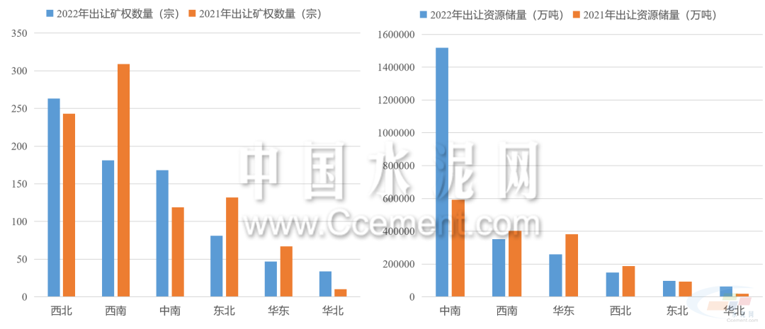2022年礦權(quán)出讓呈現(xiàn)數(shù)量減少,儲(chǔ)量增長的特點(diǎn)。據(jù)目前已公布的礦權(quán)成交結(jié)果來看,2022年共有774宗型砂石礦權(quán)成交,同比減少12%,共計(jì)出讓資源儲(chǔ)量243.7億噸,同比增長超40%。中南地區(qū)是出讓礦權(quán)資源儲(chǔ)量最高的區(qū)域,占全國出讓資源儲(chǔ)量的六成以上,同比增長超150%。