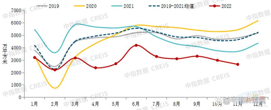 新開工方面,2022年1-11月,房屋新開工面積111632萬平方米,下降38.9%。其中,住宅新開工面積81734萬平方米,下降39.5%。單月新開工面積自4月起連續(xù)7個(gè)月同比下降超35%。11月新開工面積環(huán)比下降,絕對(duì)規(guī)模處2022年以來月度最低水平。