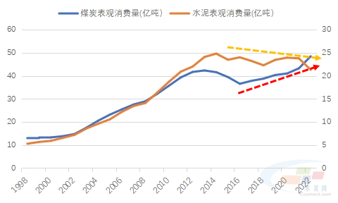 圖2:煤炭行業(yè)與水泥行業(yè)表觀消費(fèi)量走勢