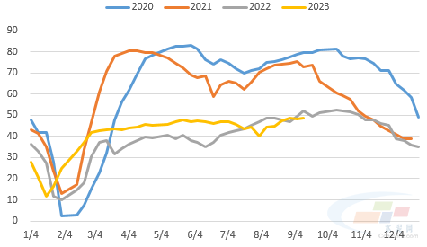 按照往年9月旺季節(jié)奏,水泥企業(yè)發(fā)運(yùn)率多在7-8成,華東和中南等需求旺盛地區(qū)甚至超過(guò)9成,然而目前全國(guó)水泥發(fā)運(yùn)率僅48.7%,不足五成,甚至不及2022年同期水平,華東、中南等熱門地區(qū)出貨量不足六成,盡管需求較之前邊際好轉(zhuǎn),但整體仍弱,水泥價(jià)格上漲的根基并不牢固。與此同時(shí),磨機(jī)運(yùn)轉(zhuǎn)率穩(wěn)步提高,水泥庫(kù)容比達(dá)到74%高位,廠家?guī)齑娓咂?,價(jià)格上行壓力較大。