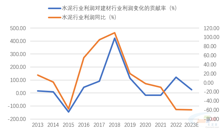 2022年,水泥行業(yè)營業(yè)收入占建材行業(yè)的14%,利潤總額占建材行業(yè)的14%,均低于總資產(chǎn)占比(20%),行業(yè)銷售利潤率也已經(jīng)低于建材行業(yè)平均水平。2023年,水泥行業(yè)景氣度進一步下滑,上半年利潤總額大幅下滑60%,是拖累今年建材工業(yè)增加值增速明顯放緩的重要原因。作為建材行業(yè)第二大子行業(yè),水泥制造業(yè)的經(jīng)營穩(wěn)定對建材行業(yè)的穩(wěn)增長至關(guān)重要。從歷史數(shù)據(jù)看,水泥行業(yè)利潤的大幅波動,都會造成建材行業(yè)的利潤大幅度波動(圖2)。因此,筆者認為,建材行業(yè)要實現(xiàn)穩(wěn)增長目標,水泥行業(yè)必須打頭陣,只有水泥行業(yè)穩(wěn)住并實現(xiàn)一定的增長,建材工業(yè)實現(xiàn)2023-2024年的增加值增速目標才有希望。