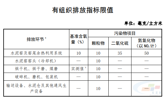 (一)有組織排放控制指標(biāo)。在基準(zhǔn)含氧量 10%的條件下,水泥 窯及窯尾余熱利用系統(tǒng)廢氣顆粒物、二氧化硫、氮氧化物排放濃度小時(shí)均值分別不高于 10mg/m3、35mg/m3、50mg/m3。其他有組織排放,氨等表中未作規(guī)定的按國家或地方標(biāo)準(zhǔn)執(zhí)行。達(dá)到超低排放的水泥企業(yè)每月生產(chǎn)時(shí)間至少 95%以上時(shí)段排放濃 度小時(shí)均值滿足上述要求。