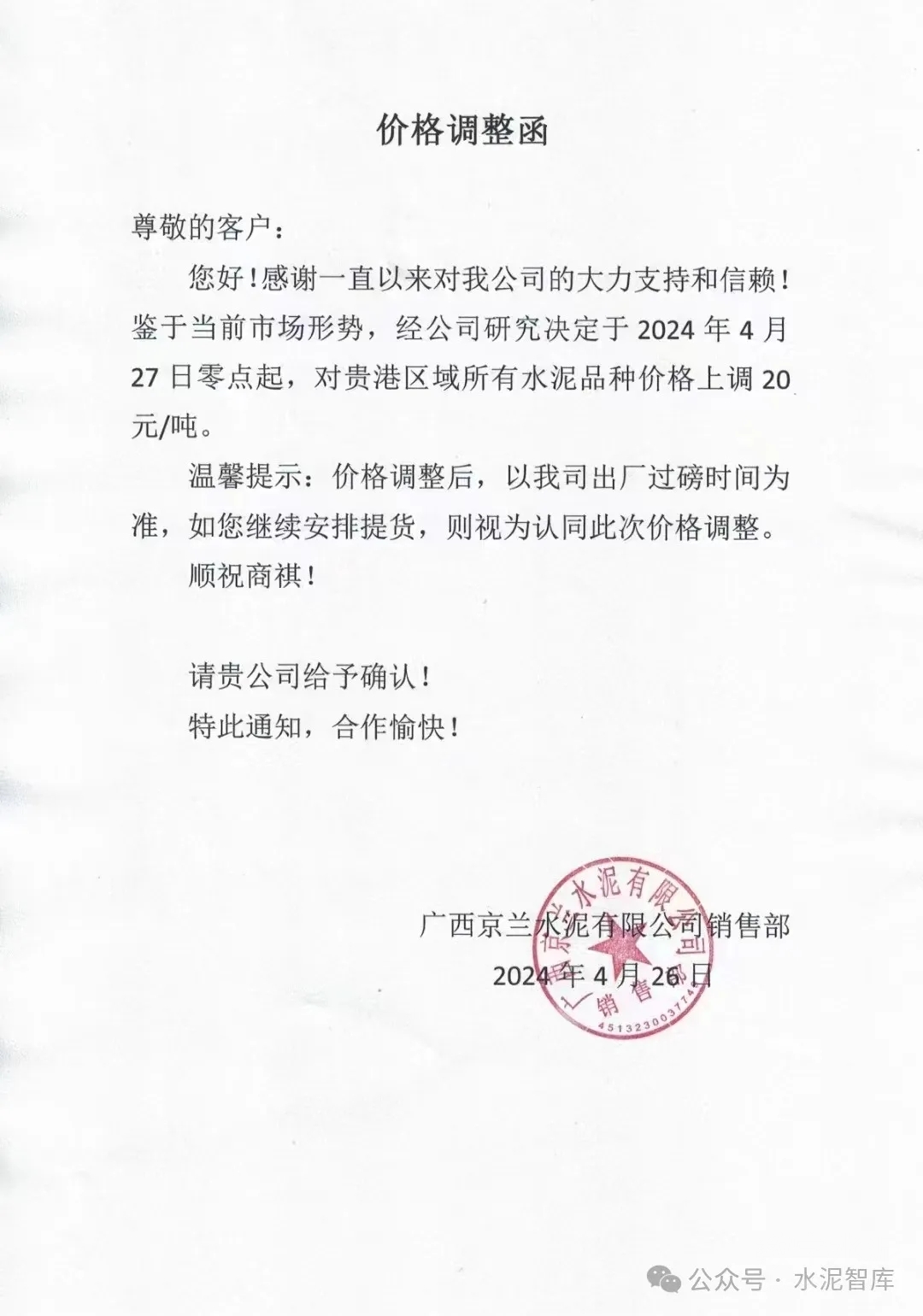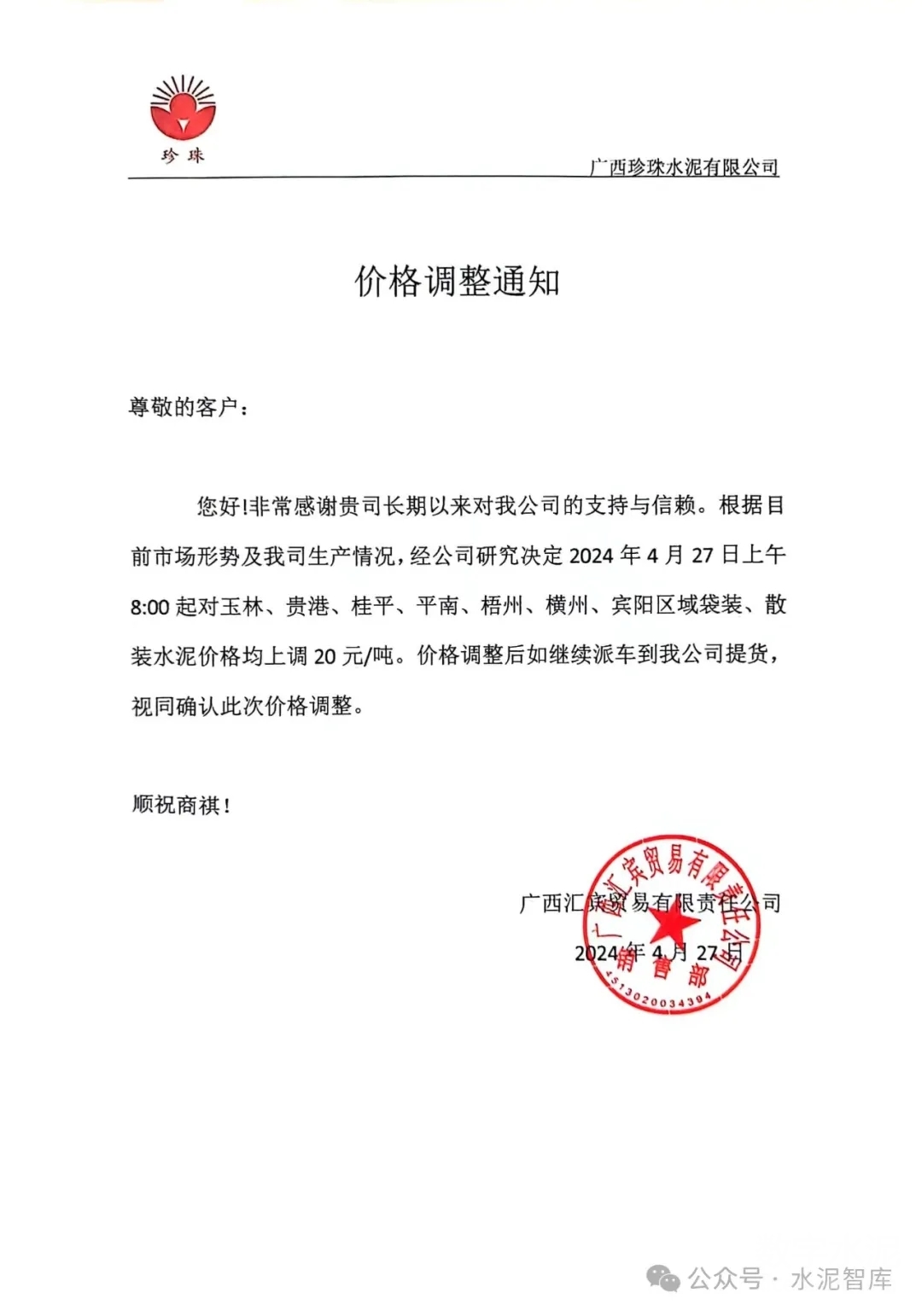 4月26日起,廣西各地級市水泥企業(yè)也陸續(xù)發(fā)布價格上漲通知,幅度20元/噸。競爭較為激烈地區(qū)P.O42.5散裝水泥價格有望從190-200元/噸上調(diào)至210-220元/噸。