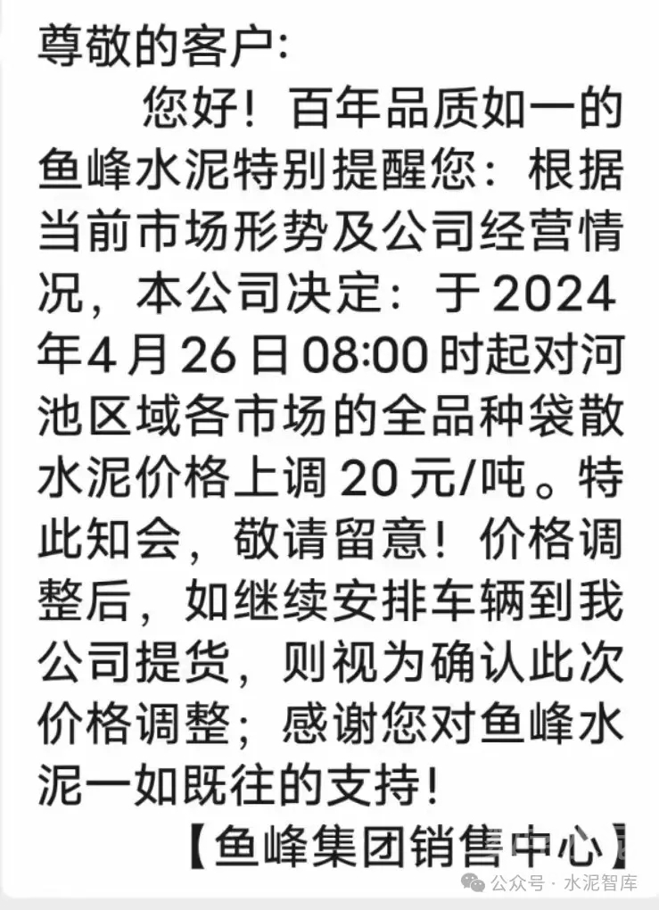 長江沿線地區(qū)水泥價格于4月中旬小幅恢復(fù)性上調(diào)后,4月24日,東北地區(qū)因虧損嚴重,企業(yè)經(jīng)營困難,發(fā)布大幅上漲消息,通知上調(diào)20-60元/噸。