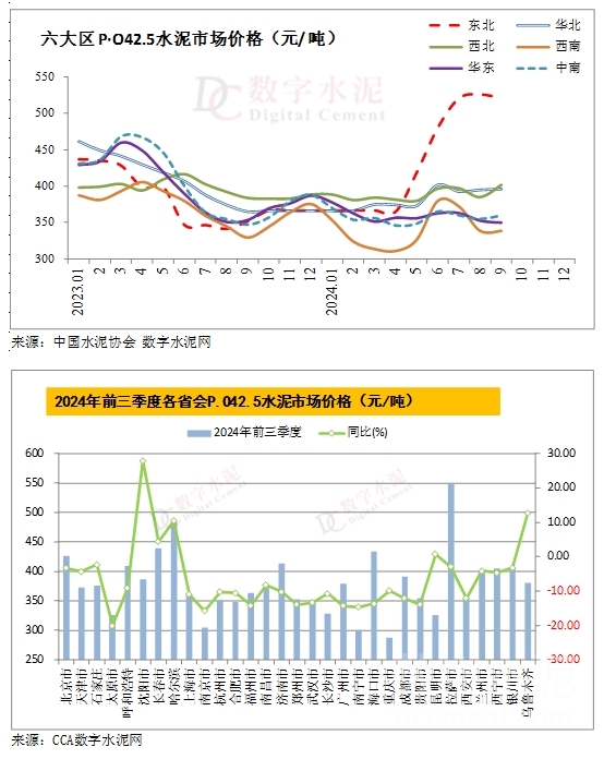 分區(qū)域來看,前三季度東北水泥價格獨占鰲頭,均價達437元/噸,遠超全國均價64元,同比增長12.8%,施工旺季更是飆升至522元/噸,較去年同期高出175元/噸。此成就得益于區(qū)內(nèi)企業(yè)嚴格執(zhí)行錯峰生產(chǎn),限產(chǎn)力度大,庫存低位,供需關系持續(xù)優(yōu)化。