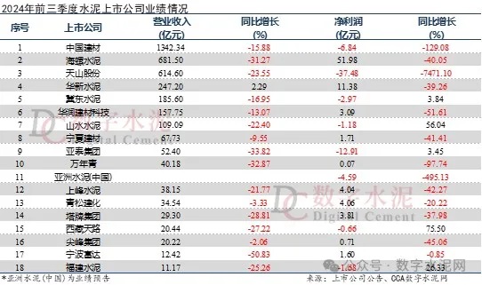 從水泥主業(yè)上市公司前三季度業(yè)績來看,多數(shù)公司收入和利潤均同比大幅下滑。在行業(yè)整體下滑的背景下,8家水泥上市公司呈現(xiàn)虧損狀態(tài),有13家凈利同比下降。海螺水泥和華新水泥分別位居凈利潤前兩位。盡管前三季度業(yè)績不佳,但后期水泥行業(yè)仍有望通過政策調(diào)整、市場需求改善等因素實現(xiàn)業(yè)績回升?。